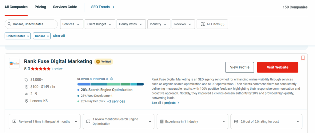Lenexa, KS – 2025 — Rank Fuse Digital Marketing, an agency providing online marketing services, has been crowned the top SEO company in Kansas by Clutch in 2025. Based in Lenexa, KS, our SEO services include on-page and off-page optimization, content marketing, and more to organically grow our clients’ online presence, leading to higher engagement and conversions.