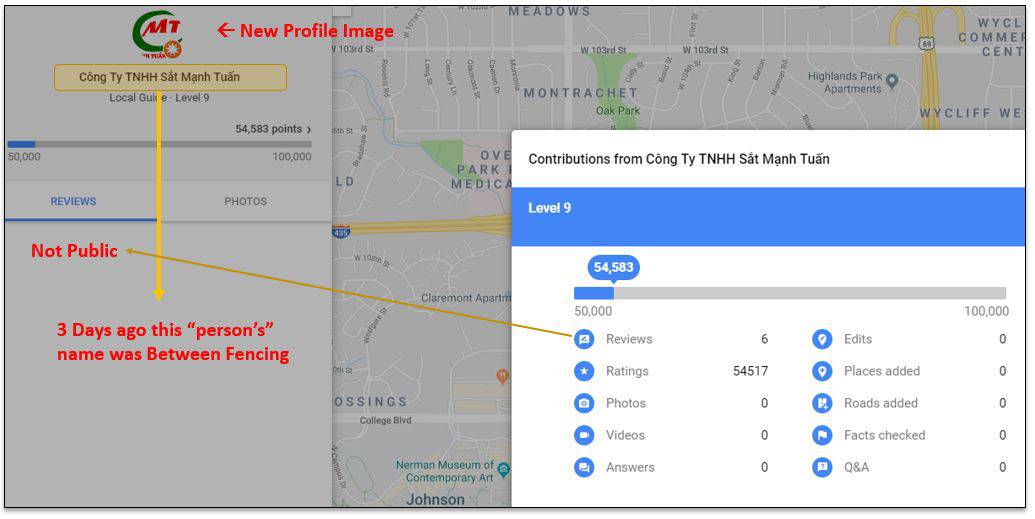 This network of Google Reviews Spammers is not stopping. They have changed names on their profiles and are passing out Google Ratings at a high enough volume to maintain their Local Guide points. For example, if you click on my Between Fencing profile I named below (#3). This “Local Guide” has uploaded a new profile photo and changed their name to: “C?ng Ty TNHH S?t M?nh Tu?n“.