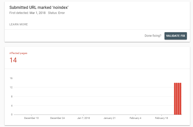 You can go to Search Console to check out the problem under the “Submitted URL marked ‘noindex.’ In our experience, there has been a sampling of 7-14 random URLs that get caught up. Fortunately, Google Search Console lists each URL issue for you and so you can investigate each URL marked as no index and see if there is an error.